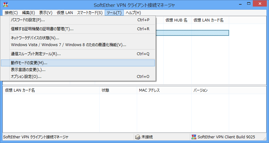 サービスを無効にしたりするには、「ツール」メニューの「動作モードの変更」を起動し、「VPN
